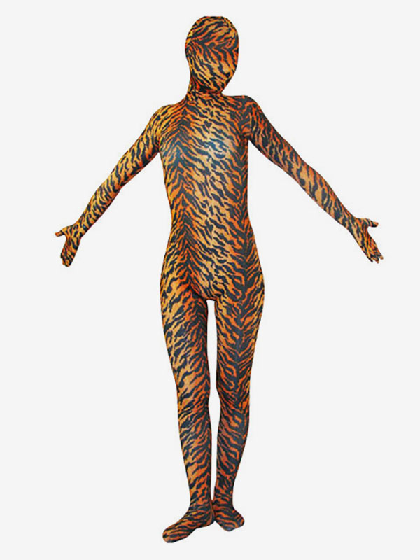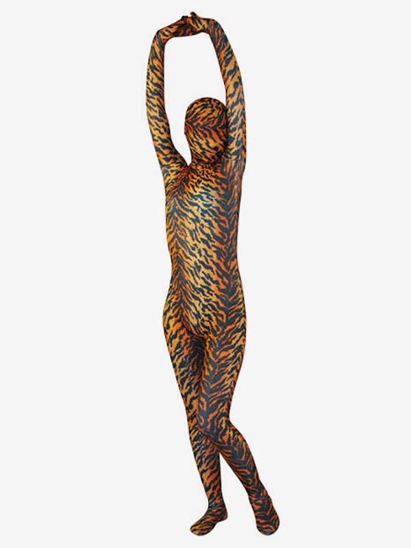 Zentai suits – commonly known as catsuits – are form fitting jumpsuits made from Spandex to create a the appearance of a second skin. They are popular with dancers, theater performers and other performing artists. Entail suits come in a variety of styles – from all inclusive, meaning the entire body is covered – to semi-inclusive meaning certain parts are left exposed. This one features a fashionable tiger pattern throughout and would look great worn for animal scenes!